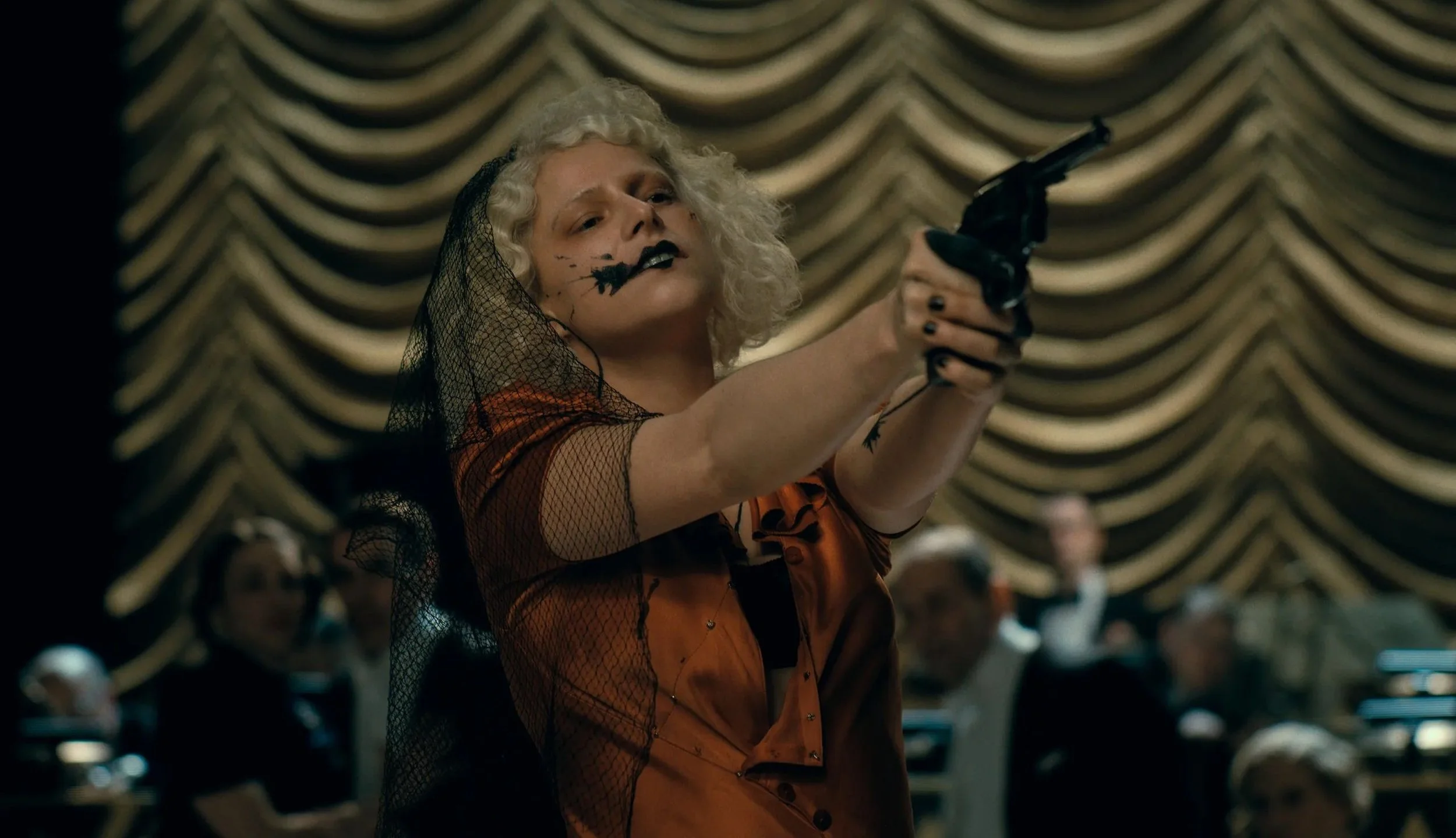 This BRIDE, like the Whale film, opens with an onscreen appearance by Mary Shelley, played – as with Elsa Lanchester in the 1935 movie – by the same actress (Jessie Buckley) who portrays the titular role herself. This incarnation of Shelley talks directly to the camera to confess she didn’t get to write FRANKENSTEIN as she wanted, before an explicit statement of the movie’s intent: “Here comes the motherfucking Bride!” It’s 1936 Chicago and Buckley’s Ida is possessed by Shelley’s restless spirit at a party, her subsequent behaviour and revelations resulting in her swift demise courtesy of a prominent crime kingpin’s thugs. She is then resurrected, with distinctive stained skin, by mad scientist Dr. Euphronious (Annette Bening, splendidly channelling Ernest Thesiger) as a favour to the lonely “Frank” (Christian Bale), a man-made monster yearning for a romantic partner.